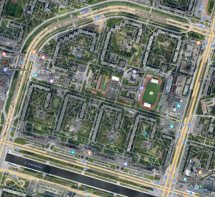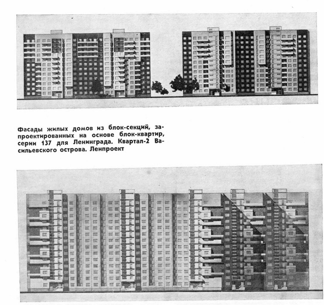 СТАТЬЯ О СЕРИИ 137. Введение В этой статье рассмотрим развитие домов 137 серии на примере квартала 2 на острове Декабристов. Второй дом серииВторой по времени возведения экспериментальный жилой дом в линейке первого поколения серии 137, по адресу Наличная ул, 40к2 проектировался и строился почти одновременно с первым домом. Он введен в эксплуатацию спустя 3 месяца после сдачи здания на Белградской ,8 (об этом доме есть Статья Дмитрия Гусарова и Статья Артема Лапина). И входит в состав застройки описываемого квартала 2. Расположен в южной части квартала (внизу). Всего 166 квартир, 2 меридиональные секции- торцевая 1-2-2-2-2-3-4 и рядовая 1-2-2-2-2-3-3 в каждой секции 83 квартиры на 12 этажах. На 1 этаже - 6 квартир, с 2-12 этажи по 7 квартир. Планировка всех квартир довольно комфортная. Секции отзеркалены относительно друг друга, благодаря чему здание имеет законченное композиционное решение фасадов. На этом доме впервые наглядно продемонстрирован блокквартирный метод, разнообразие фасадов достигнуто за счет разной планировки этажей, выступов. Композиция фасадов, усложненная благодаря разной группировки балконов и лоджий, эркеров на этажах. К достоинствам отнесем интересную пластику фасадов данного блокквартирного метода, показав неограниченные возможности для создания разнообразных фасадов. К недостаткам данного проекта следует отнести отсутствие лоджий и балконов в ряде квартир. По этом проекту было построено еще три дома, расположенных в том же квартале: Наличная ул, 40к5, ул. Кораблестроителей, 29к2 и 29к5, в южной его части. Стоит отметить что у этих последующих домов есть небольшие отличия в форме балконов. Если у первого дома - балконы прямые, то у тех, что ближе к Кораблестроителей уже полукруглые. В дальнейшем, в квартале 2, в северной его части были использованы только рядовые меридиональные секции для 12 этажных домов. О них чуть ниже. Закрывая с западной и северной сторон ранее описанные дома, расположены четыре девятиэтажных 8-ми секционных Г-образных дома.