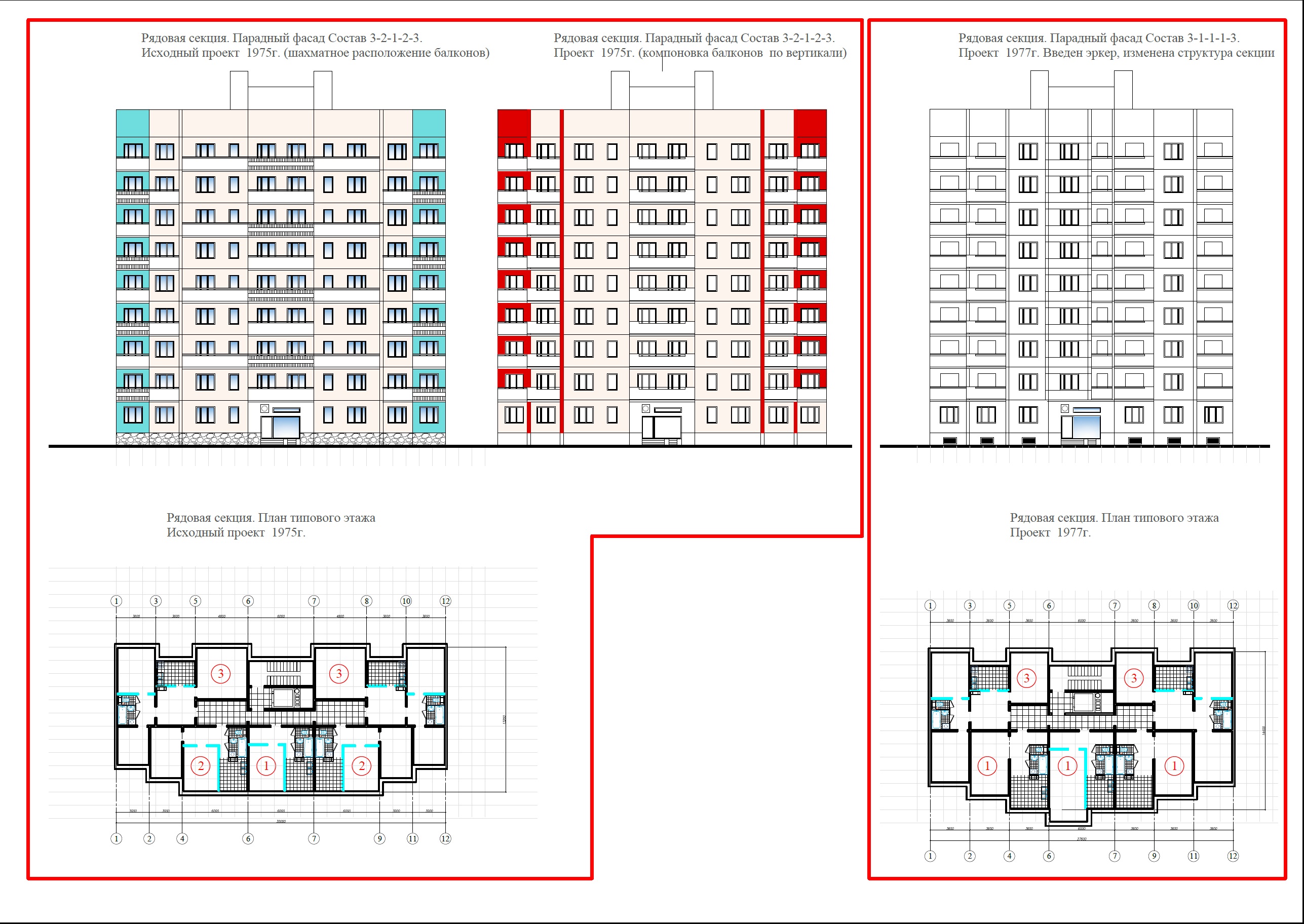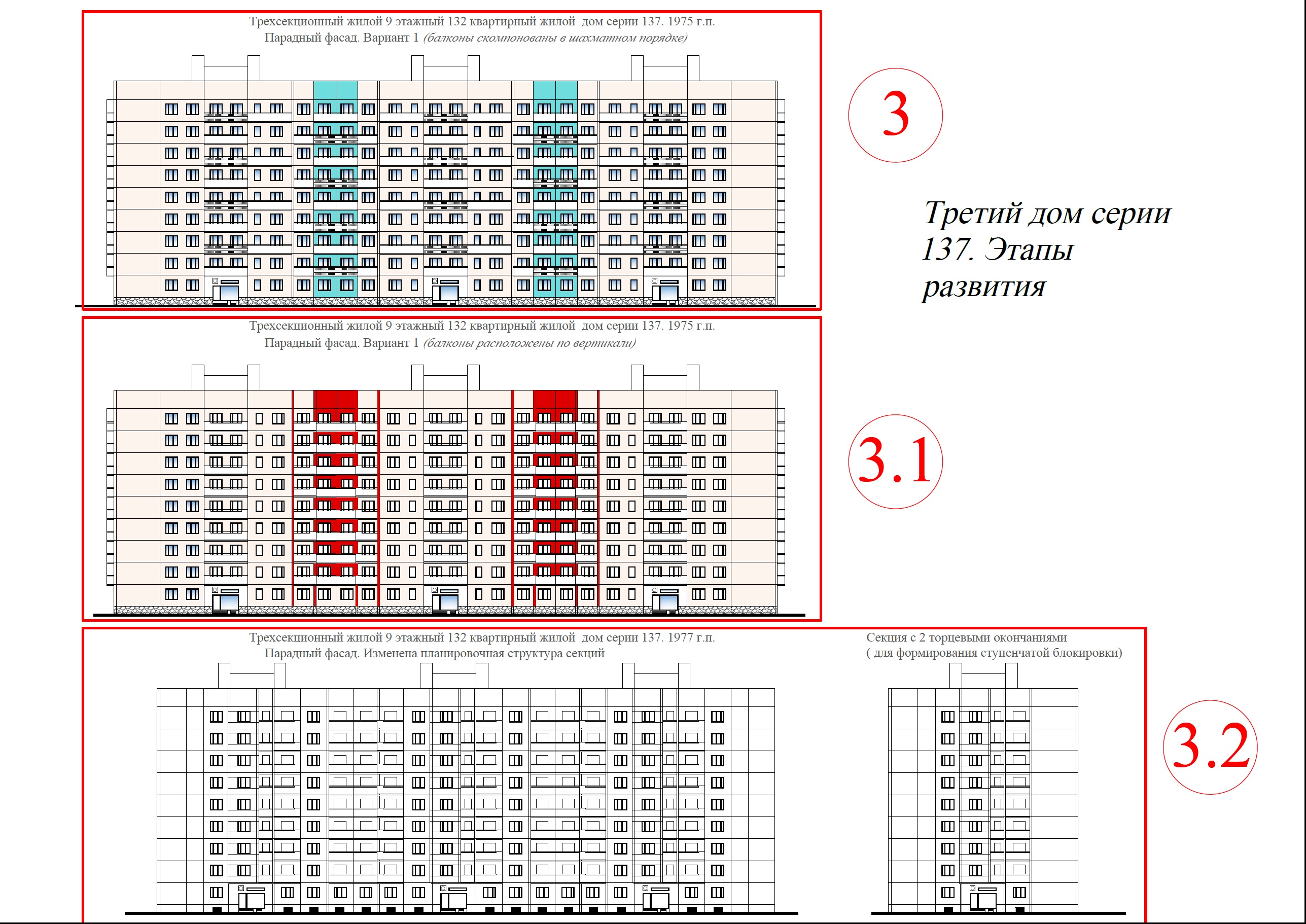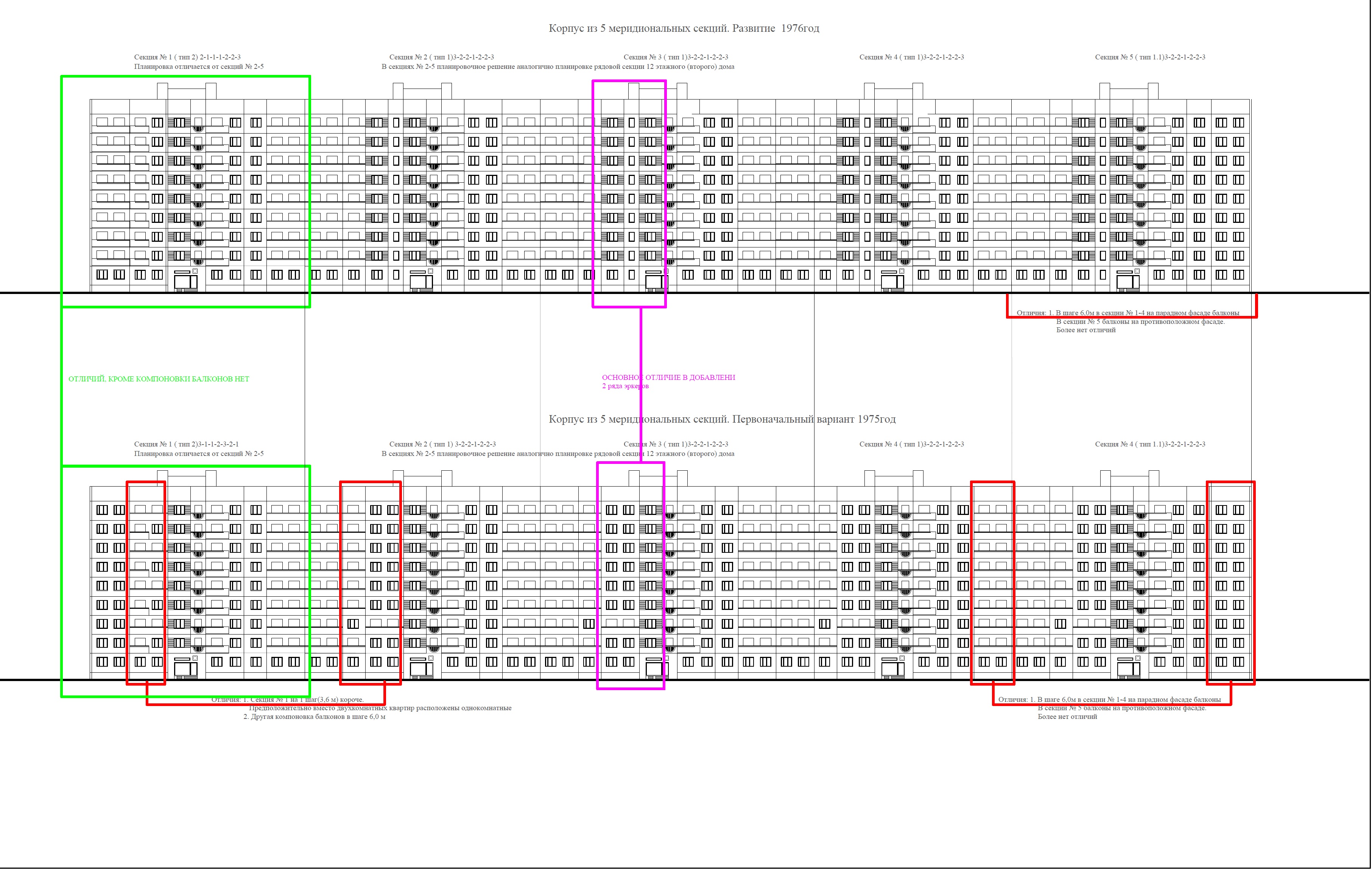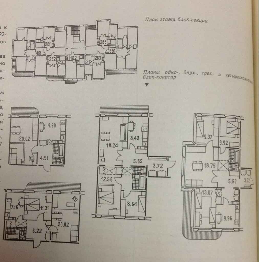 Их адреса: Наличная ул, 40к4 (самый ранний из них – 1975г.), 40к7, ул. Кораблестроителей, 29к1 и 29к4. Каждый из них состоит из трех широтных и пяти меридиональных секций. Как и в случаи с 12-ти этажными домами, и эти девятиэтажные менялись, изменялся вид секций. Что широтных, что меридиональных. Для понимания: основное отличие широтной и меридиональной ориентации секций в высотных домах заключается в направлении окон квартир: На примере проектных решений, представленных в сборнике "Архитектурное творчество СССР" 1979г, видно, что 9 и 12 этажные дома выполнены на основе одной планировочной структуры, с богатой пластикой фасадов. Следует отметить, в реализованном виде секции немного отличаются от проекта. Это лишний раз показывает возможность создавать интересные и вариантные архитектурные решения на основе блокквартирного метода. Всего присутствует два типа меридиональных секций, по 62 квартиры у каждого типа. Секции первого дома из этих четырех, в восточной части - Наличная ул, 40к4, построенного в 1975г. с частично шахматным порядком расположения балконов. Смысл, расположения балконов в шахматном порядке, конечно, понятен - отойти от унылых фасадов, опыт серии БС это наглядно продемонстрировал. Но в эксплуатационном отношении вышло все не так удачно, а безсистемное остекление убило затею. Широтные секции, в количестве трех штук у каждого из домов, состыкованы с вышеописанными под углом 90 градусов и аналогично меридиональным менялись при движении на запад. В общем, это трехсекционный 9 этажный 132 квартирный дом по 44 квартиры в секции. Рядовая секция имеет состав квартир: 3-2-1-2-3. У первого дома балконы скомпонованы в шахматном порядке (аналогично меридиональным), а у последующих балконы расположены по вертикали и скругленные. В целом вышел еще один интересный и достойный как по архитектуре фасадов, так и по планировке квартир дом. И главное - большое разнообразие решений. Но развитие домов 1 поколения, в том числе 9-ти этажных не остановилось. Именно у этих домов можно наблюдать окончательное решение 9 этажных широтных секций (с 1977г). Это первые три секции у каждого из указанных выше домов по Кораблестроителей. Состав рядовой секции поменялся - он стал 1-1-1-3-3, произошли изменения и в торцевых секциях. В отличии от самых первых торцевых 9 этажных домов, напоминающих в чем-то торцевые секции домов 1ЛГ-602 серии, представленные секции с торцевым окончанием имеют более сложный план и максимальный световой фронт и могут быть еще и состыкованы с другими корпусами, выступая в роли угловых. При этом стыковка осуществляется с некоторым отступом, не на всю ширину корпуса, что наглядно видно на примере ниже. Это угловая со смещением стыковка торцевых секций - одна из особенностей домов первого поколения 137 серии. К широтным 9 этажным секциям пристроена, и окончательная редакция меридиональных блоксекций – это 4 секции (4-7) находятся в составе дома 37 и 39к1. В этой части квартала двухсекционный 12 этажный дом на Наличной ул., 40к2 трансформировался в протяженный трехсекционный, состоящий исключительно из рядовых меридиональных секций состава 3-2-2-1-2-2-3 (без торцевых окончаний). Их всего два – секции 4-6 Кораблестроителей, 35 и секции 13-15 дома 39. Лоджии у этих домов начинаются с 6 этажа, в отличии от еще одного 12-ти этажного дома, расположенного в глубине соседнего квартала (ул. К